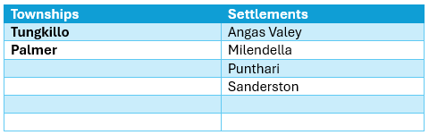 The Tungkillo – Palmer – Sanderston planning area, located south-western corner of the LGA, consists of the following housing areas.